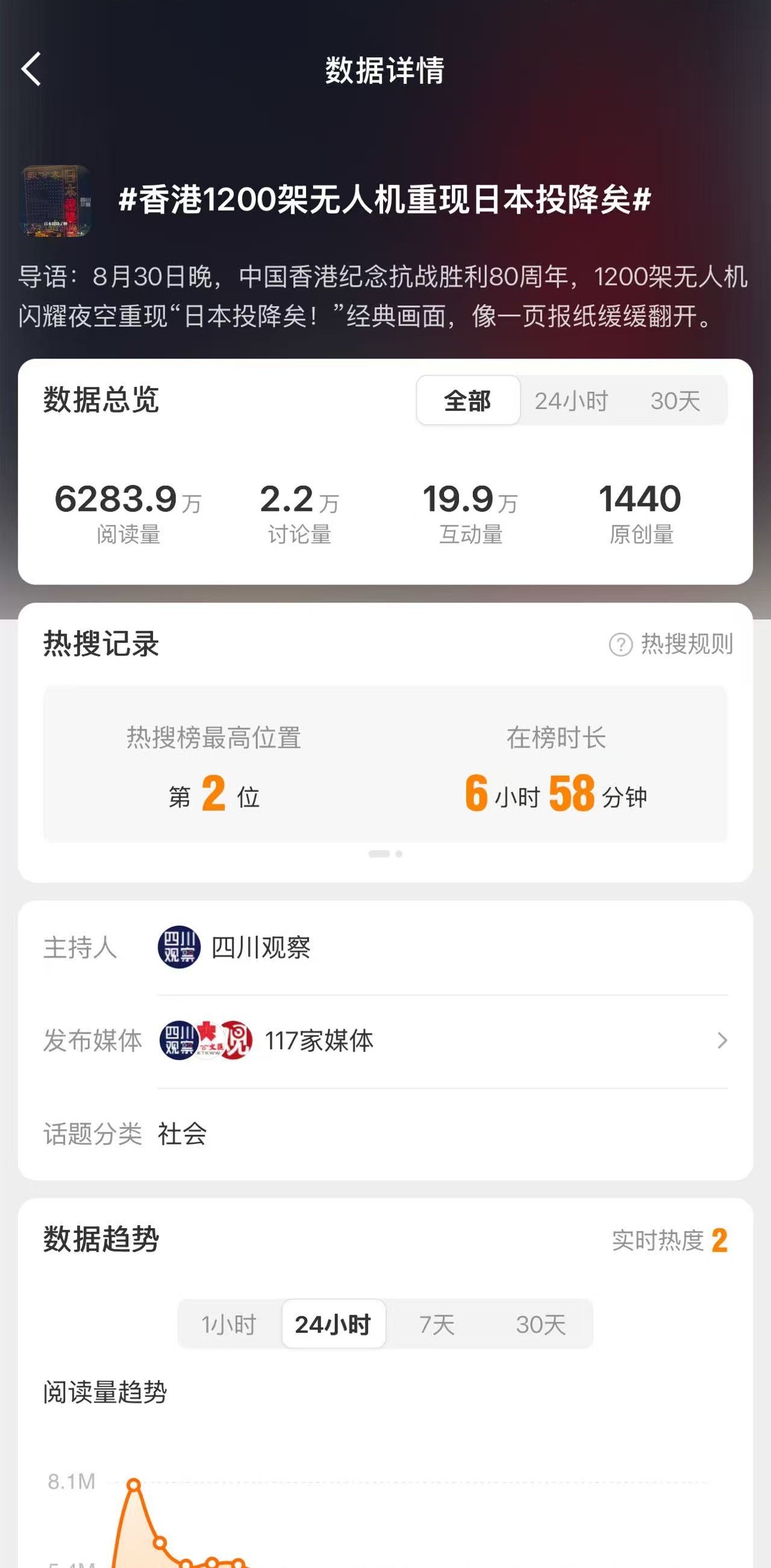 当晚,在众人欢呼声中,一只巨大的钟在维港上空徐徐摆动,下面有一行字:“九·一八 勿忘国耻”,由此拉开此次纪念中国人民抗日战争暨世界反法西斯战争胜利80周年大型无人机汇演的序幕。其后,卢沟桥事变、持枪立于船头的东江纵队战士、庆祝台儿庄大捷的漫天烟花,以及《大公报》1945年8月15日头版报道“日本投降矣”等画面依次出现,将历史节点与城市记忆串联,展现全民同心、共御外侮的峥嵘岁月。