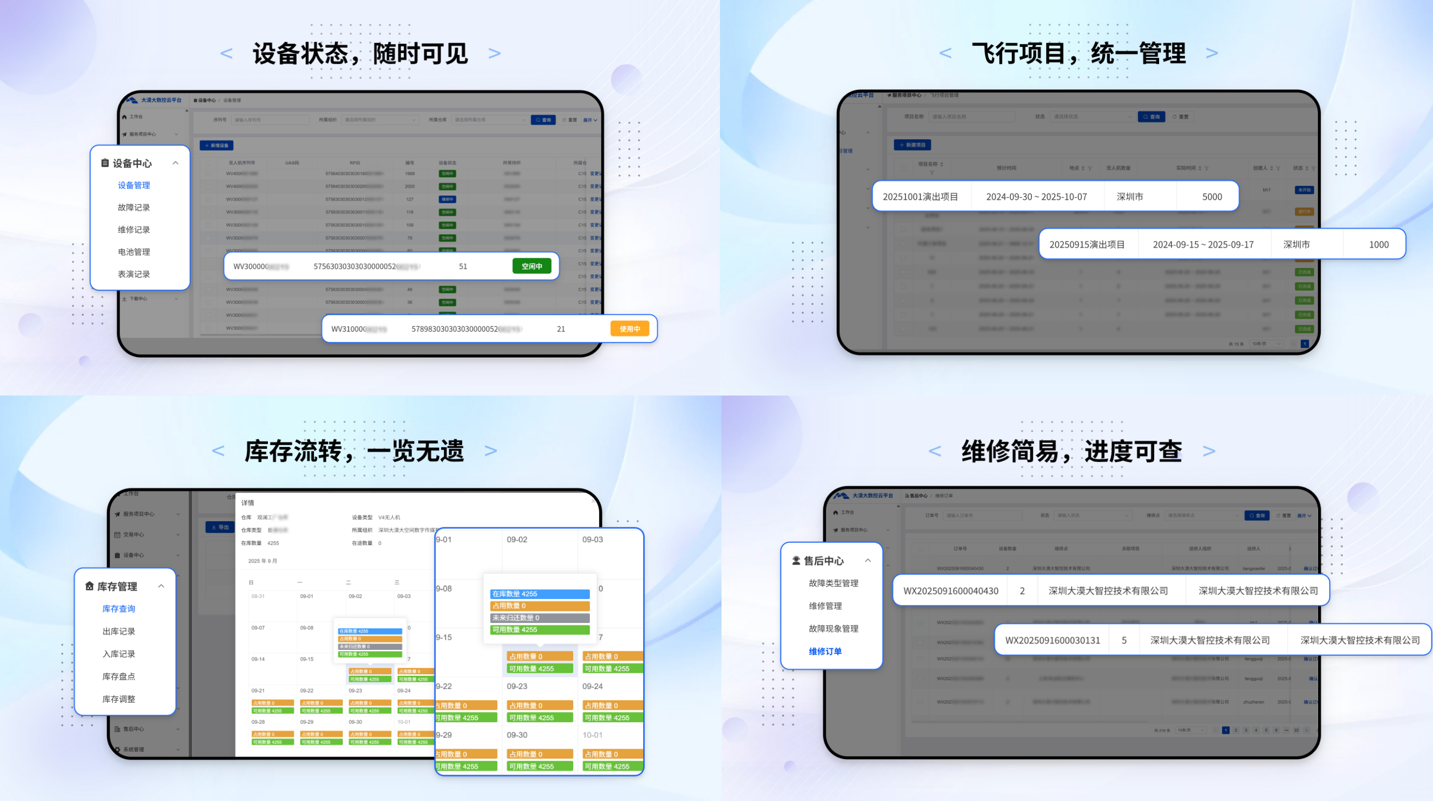 无人机集群表演作为低空经济的重要组成部分之一,是一项资源密集、技术复合、协作链条长的系统工程。而传统模式下,设备资产统计大多依赖人工台账,面临着设备状态难以追踪、项目调度缺乏统筹、售后维修响应不够高效、闲置资源利用不足等一系列管理与运营难题。如何在保障设备安全和高效使用的同时,帮助客户实现资源盘活和价值增长,成为本行业进一步走向成熟的关键问题。