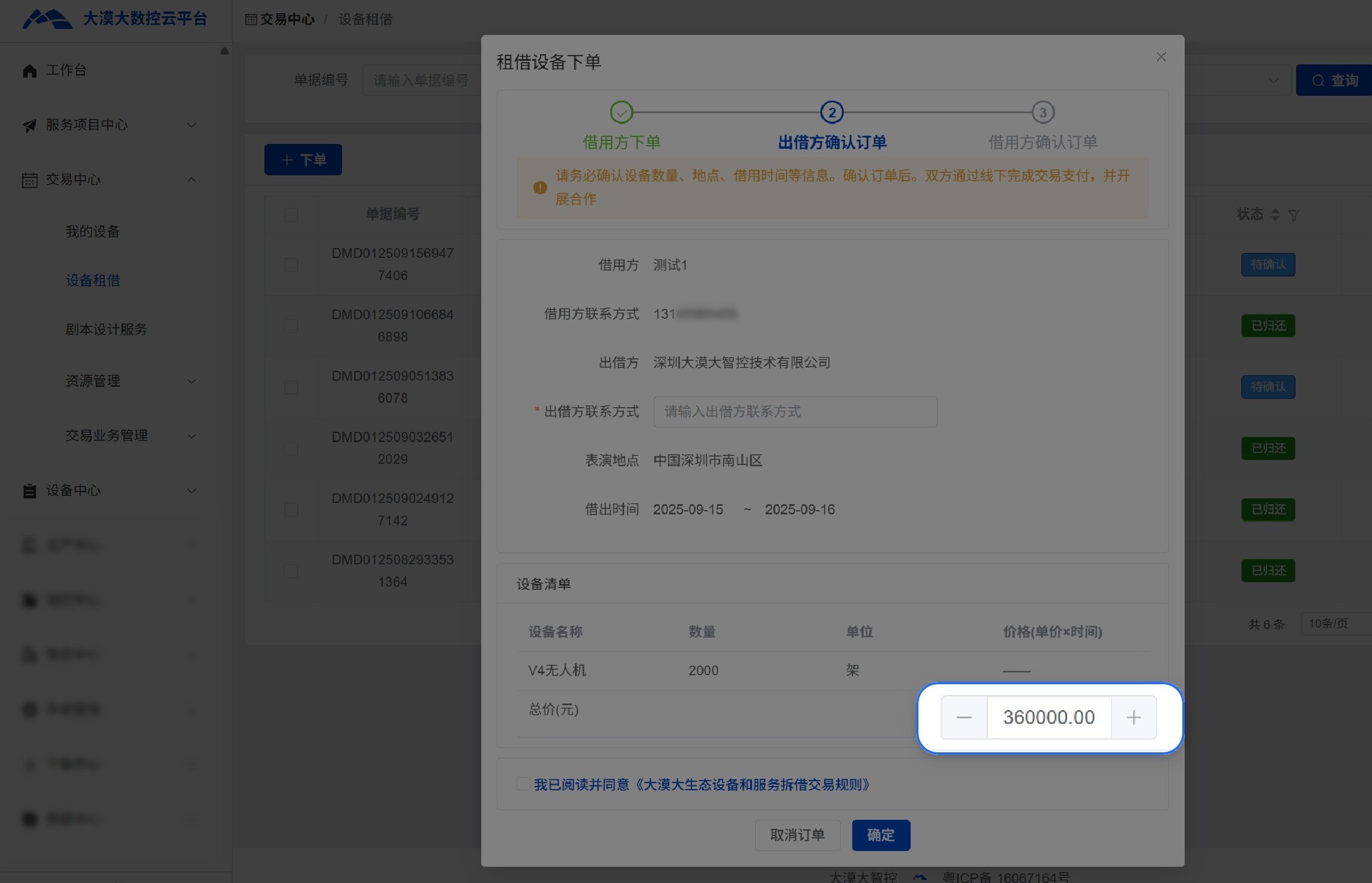 设备、库存与售后的精细化板块划分,不仅能帮助客户提升管理效率,清晰核算项目成本与收益,也提升了问题追踪的及时性和透明度,实现售后保障升级。同时,通过“生态交易管理服务”功能,客户可实现闲置无人机上架出租与借入,及设计资源交换与增值,从购入大漠大设备一开始,便能形成一套价值链条,进一步盘活设备资产。