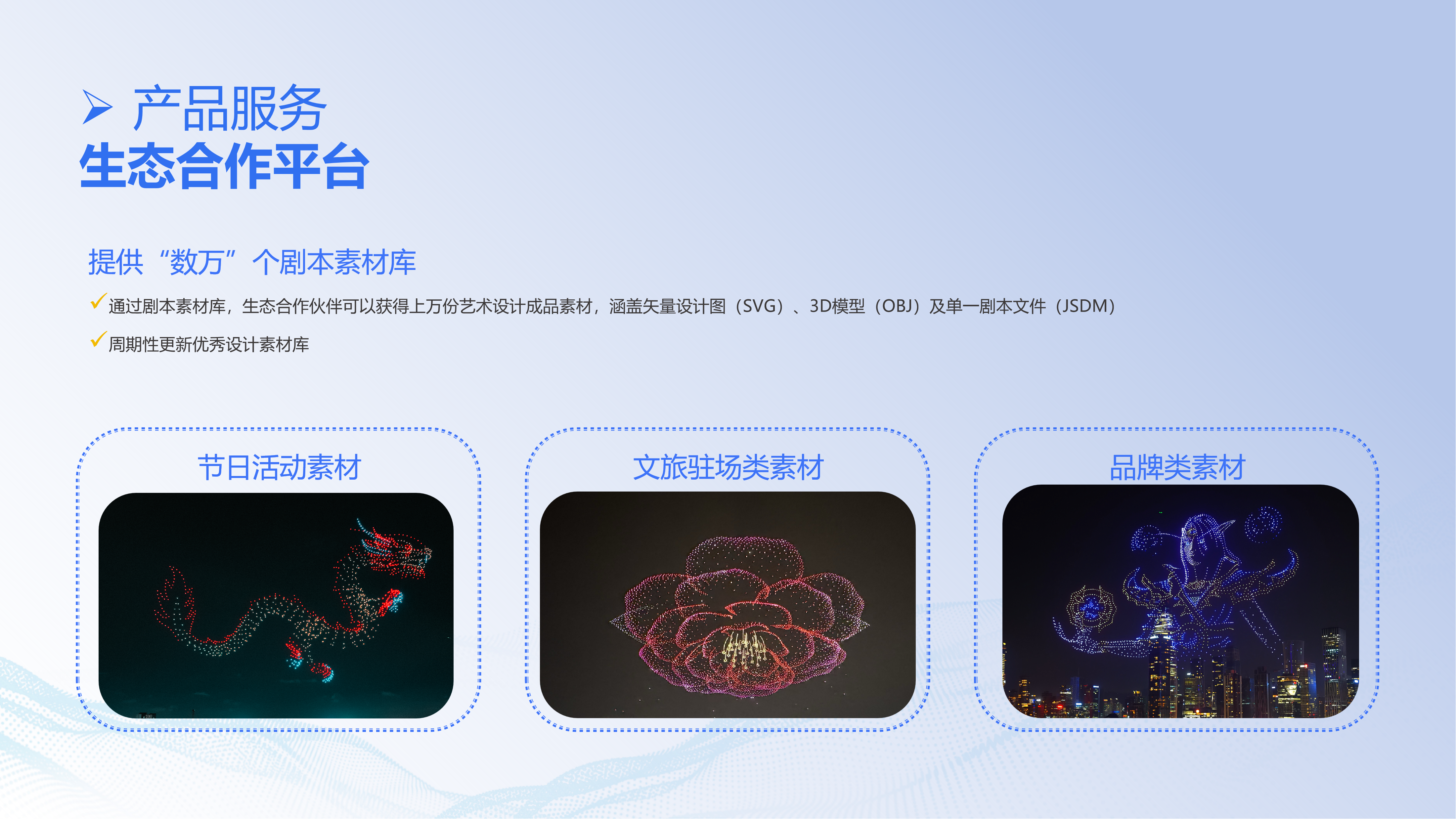 成为大漠大合作伙伴,不仅拥有安全、稳定的无人机编队设备和工具,还能通过行业独有的生态交易平台有偿共享设备资源、剧本设计资源、广告地标资源、飞行服务团队等,并可借助交易平台将提高自身资源的利用率和交易效率,共同助力合作伙伴业务快速发展。
