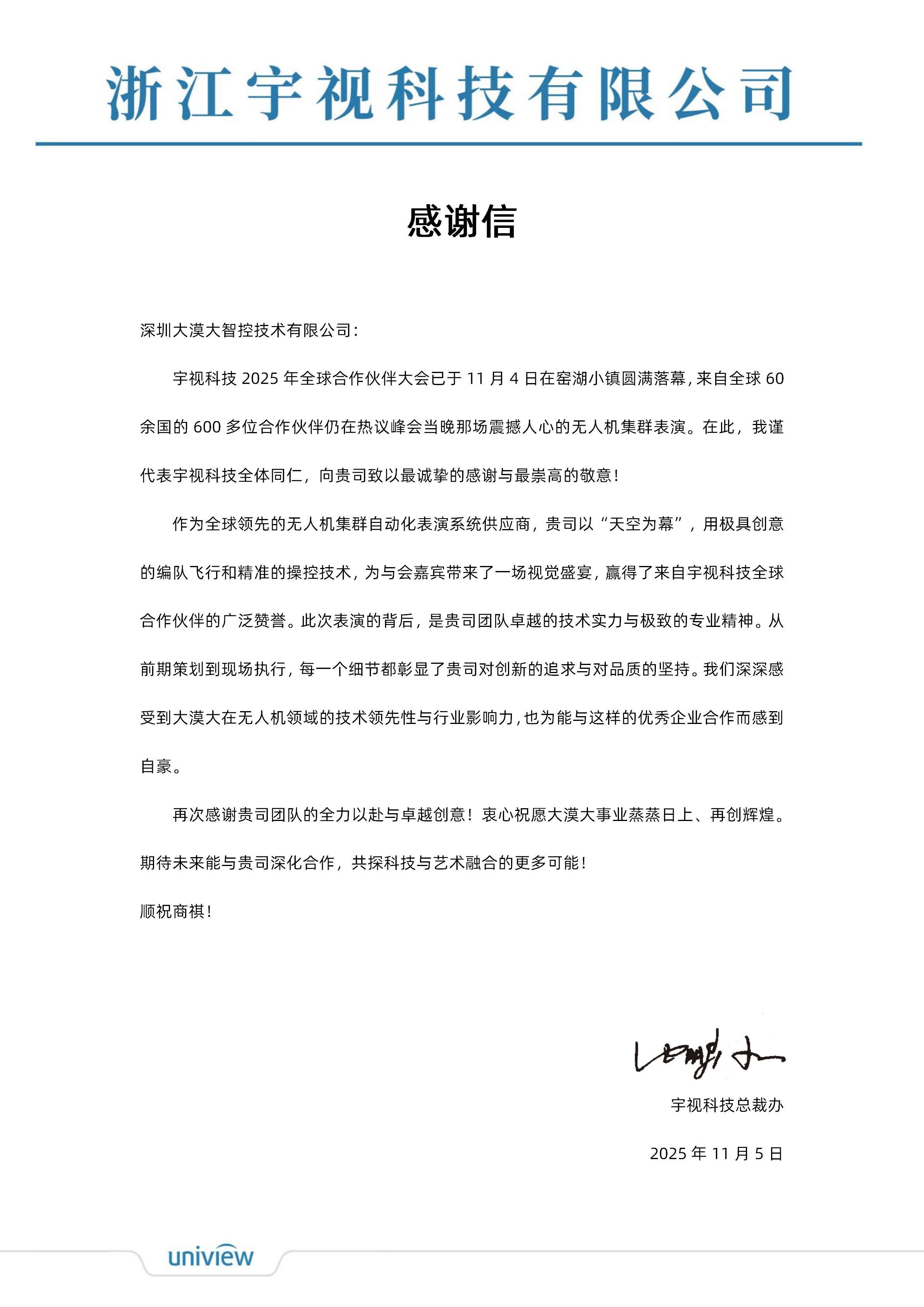 来自全球60余国的600多位合作伙伴,在现场共同见证了这场表演。会后,宇视科技总裁办专门发来感谢信,对表演给予高度评价,称赞大漠大团队“用极具创意的编队飞行和精准的操控技术,为与会嘉宾带来了一场视觉盛宴,赢得了来自宇视科技全球合作伙伴的广泛赞誉”。