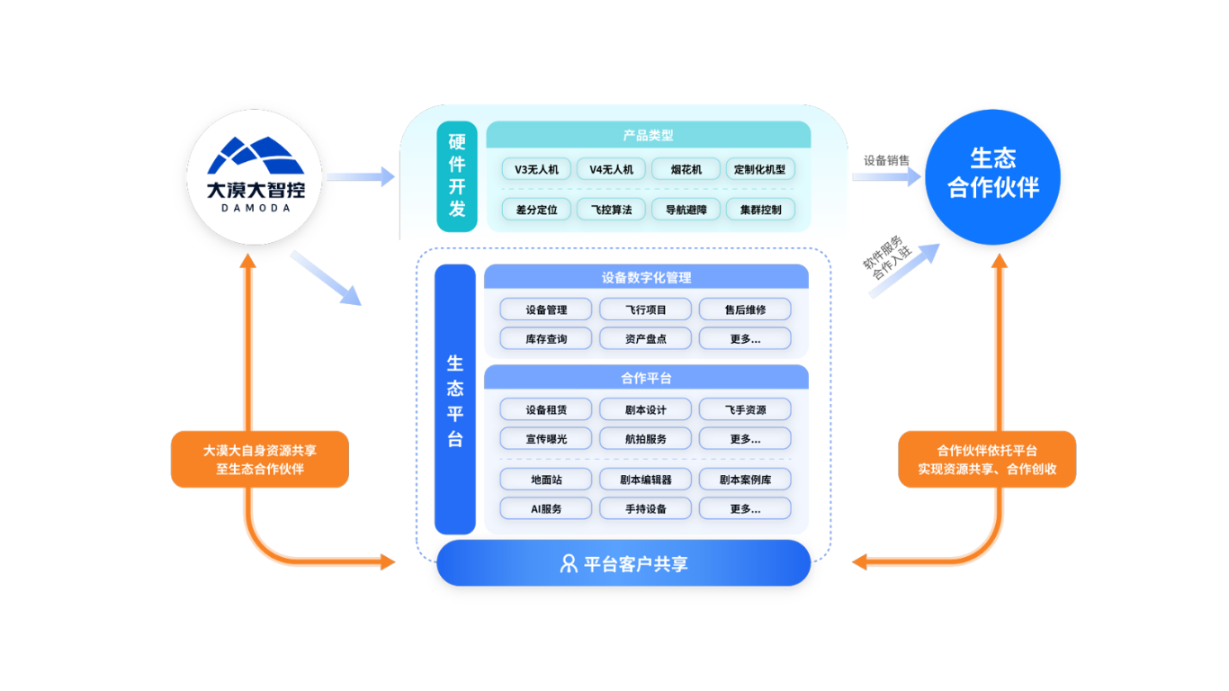 平台支持设备全生命周期的管理、维修和增值,同时聚合剧本设计、飞手资源、航拍服务等生态资源,助力合作伙伴共享大漠大的硬件、软件与市场资源
